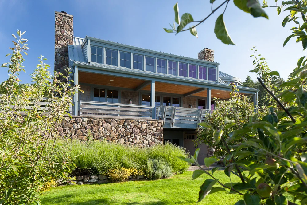 Originally designed as a multi-building boutique farm, this 3-bedroom house and guest quarters became the permanent home for a young island family. This 141-acre heavily wooded estate features a south-facing meadow ideal for grazing horses and extensive gardens. A study in reductionism; we aspired to elicit the impressions of a grand manor house while providing only what was essential. A deer-proof center court provides ample flower gardens and a wind-protected patio provides a delightful space for large family gatherings.